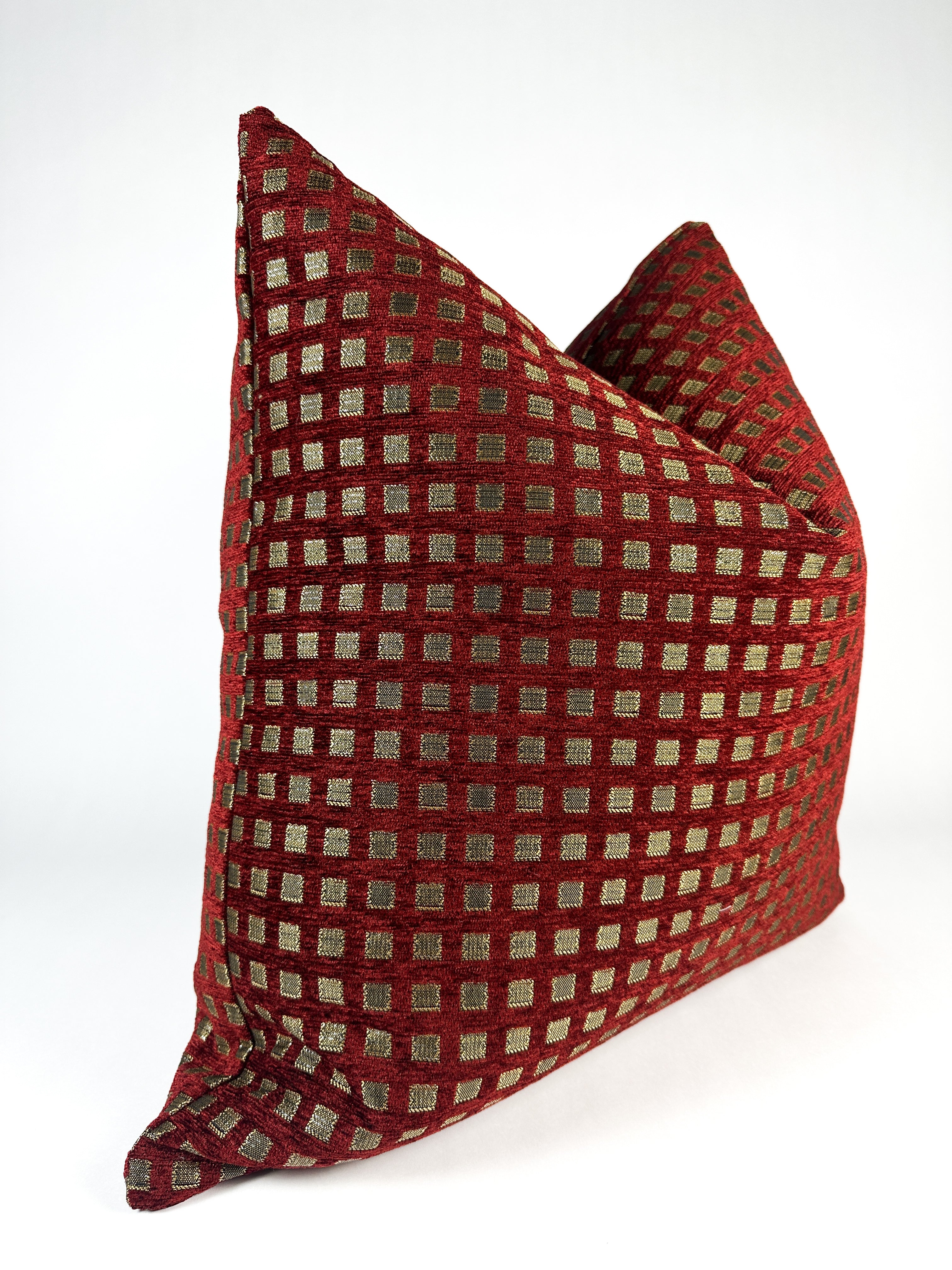 The warm red and muted gold coloration pairs beautifully with dark wood finishes, creamy neutrals, charcoal tones, and brushed brass accents. Style it alongside solid velvets, textured linens, or understated patterns to create a layered, designer-inspired arrangement with richness and cohesion.