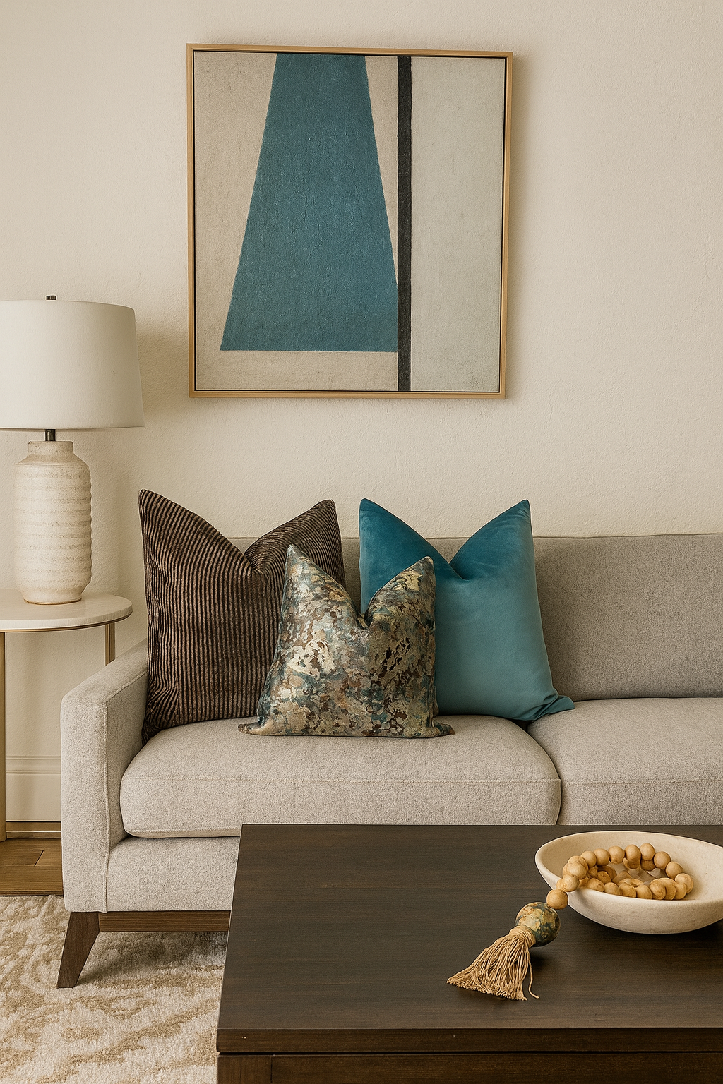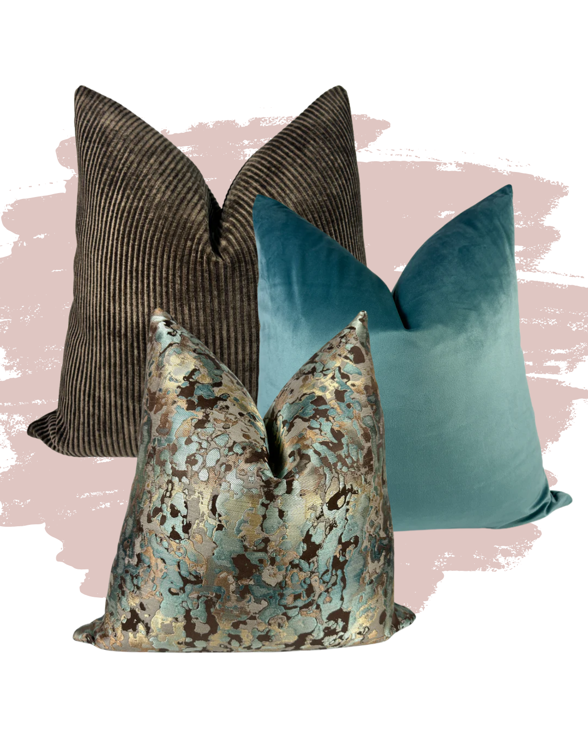 Featuring the tactile richness of Mink Corduroy, paired with the cool, velvety calm of Icicle, and finished with the dynamic movement of Chocolate and Blue Lava, this pillow combination creates striking visual interest while maintaining a refined palette. Ideal for modern, transitional, and eclectic interiors, it adds character and polish to sofas, sectionals, and styled beds.