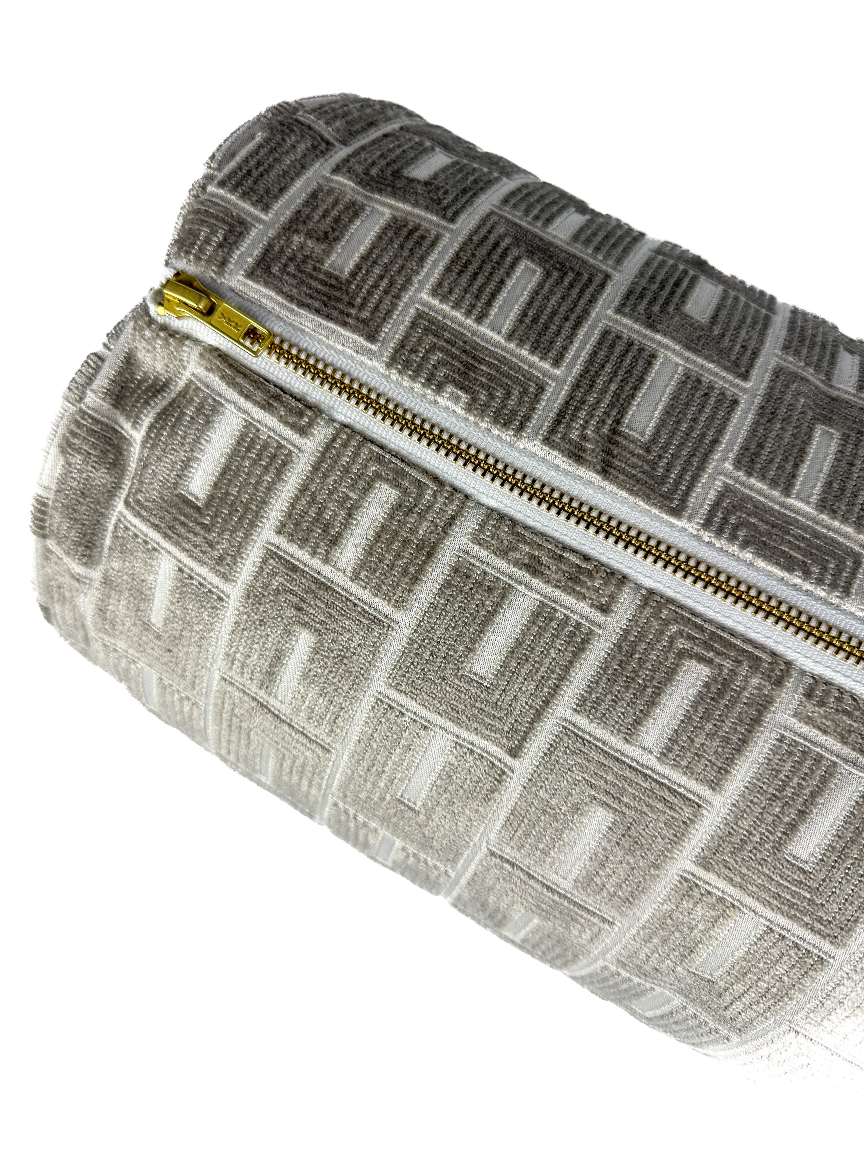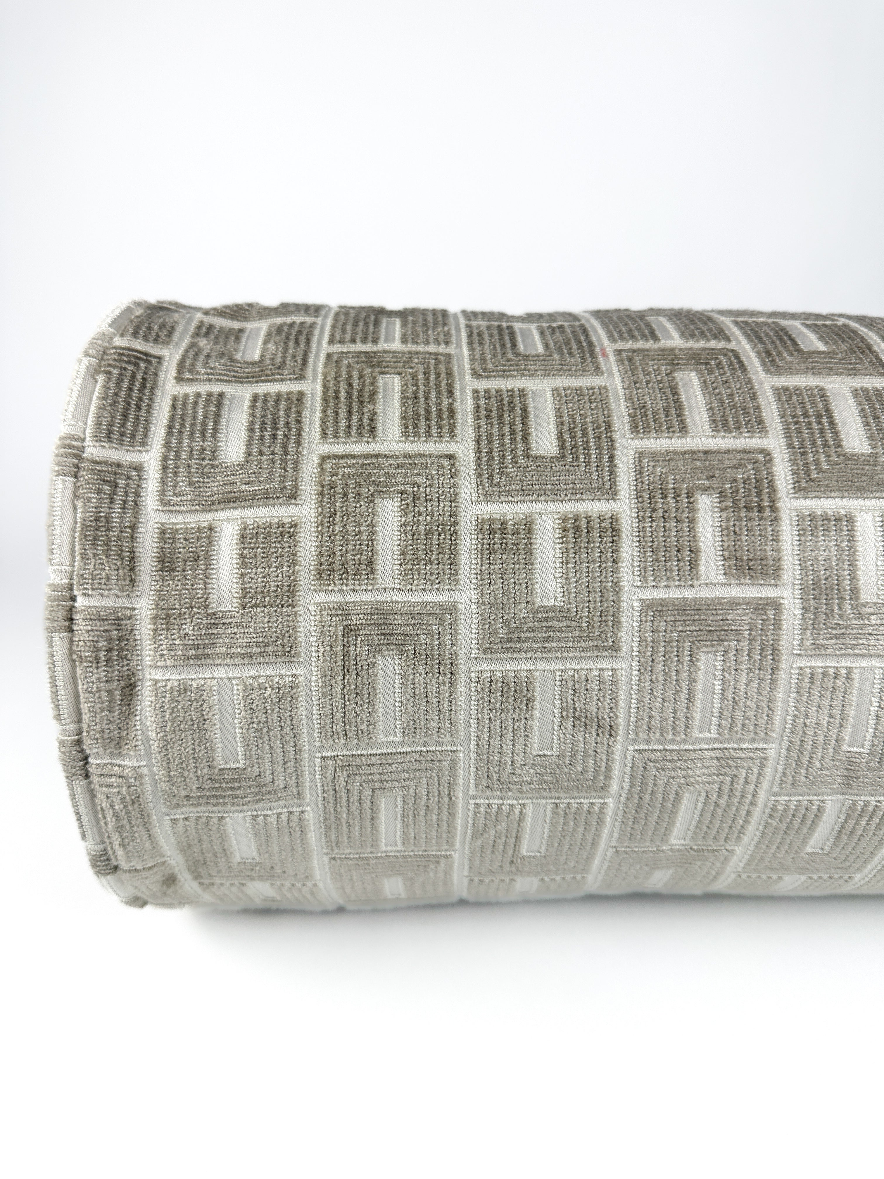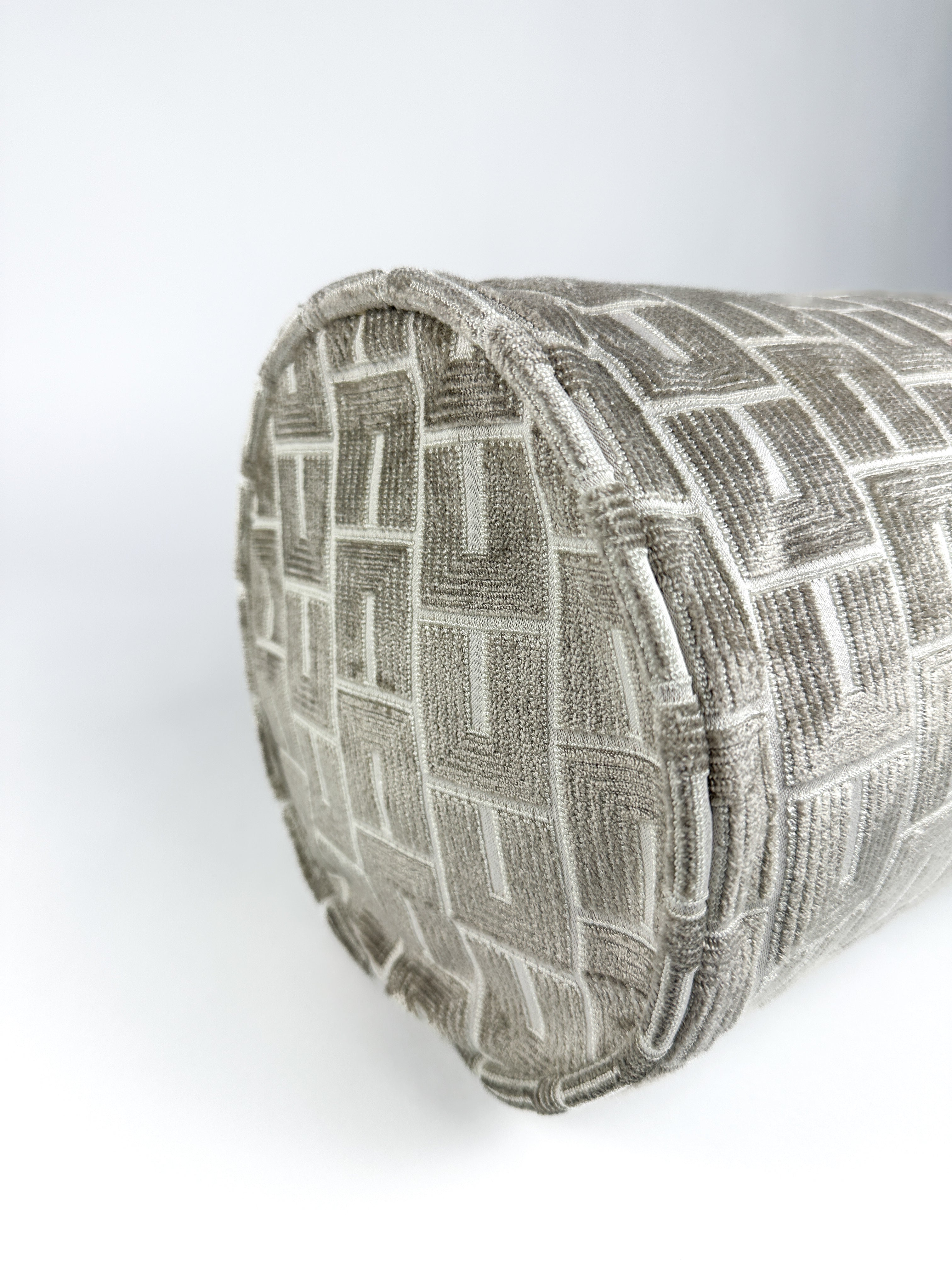 • Warm greige bolster pillow cover with subtle geometric pattern